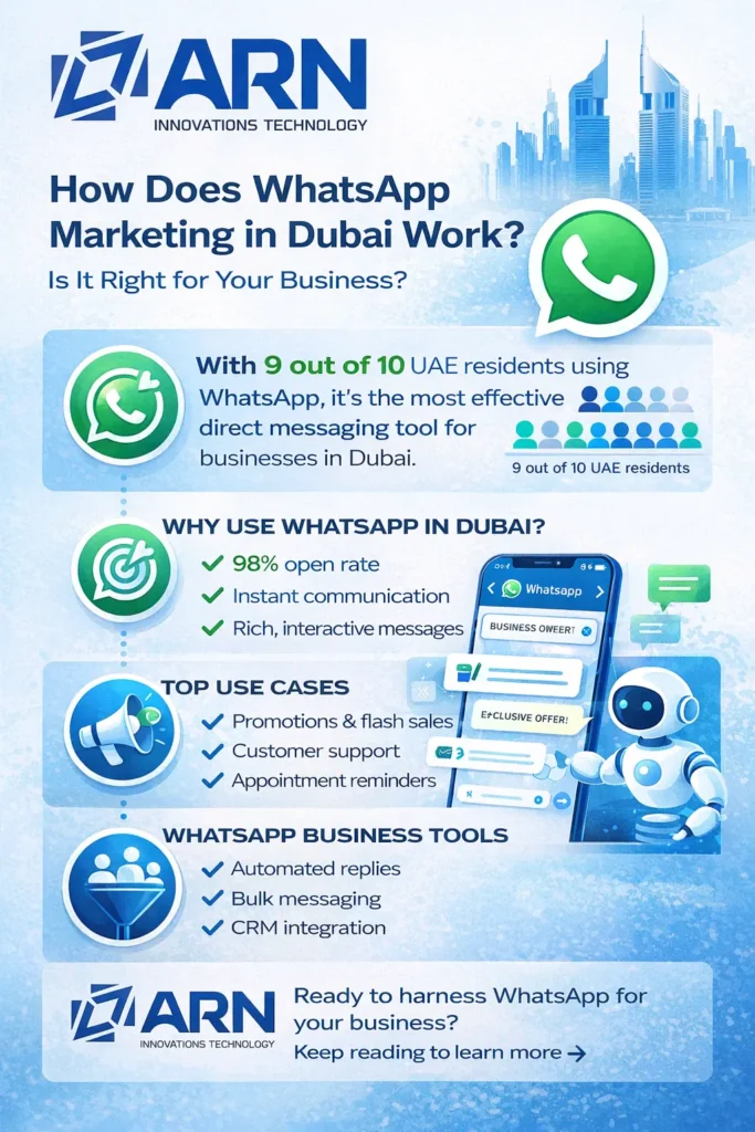 • ARN IT offers end-to-end WhatsApp marketing solutions – from API setup to ongoing campaign management – for businesses across the UAE.